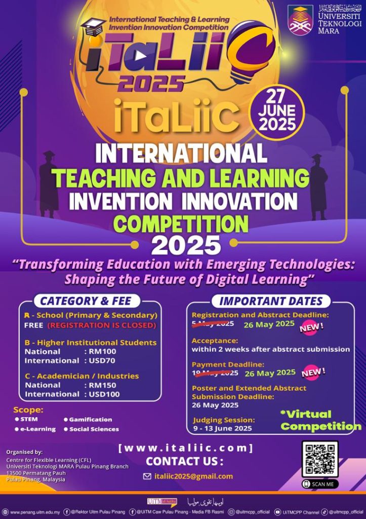 The International Teaching & Learning Invention Innovation Competition (iTaLiiC 2025) is held biennially by the Center for Flexible Learning (CFL) at UiTM Cawangan Pulau Pinang which was established in 2020. This competition serves as a platform for students, educators, and professionals to showcase their inventions and innovations specifically related to teaching and learning. It aligns with the Malaysian government’s policies to promote research and supports the Sustainable Development Goals. Conducted virtually, the competition features products presented as Virtual Posters. Its goal is to help participants enhance the commercialization of their ideas and innovations. Judging is carried out by academic experts with extensive experience in innovation, research, and commercialization. The theme for iTaLiiC 2025 is “Transforming Education with Emerging Technologies: Shaping the Future of Digital Learning“